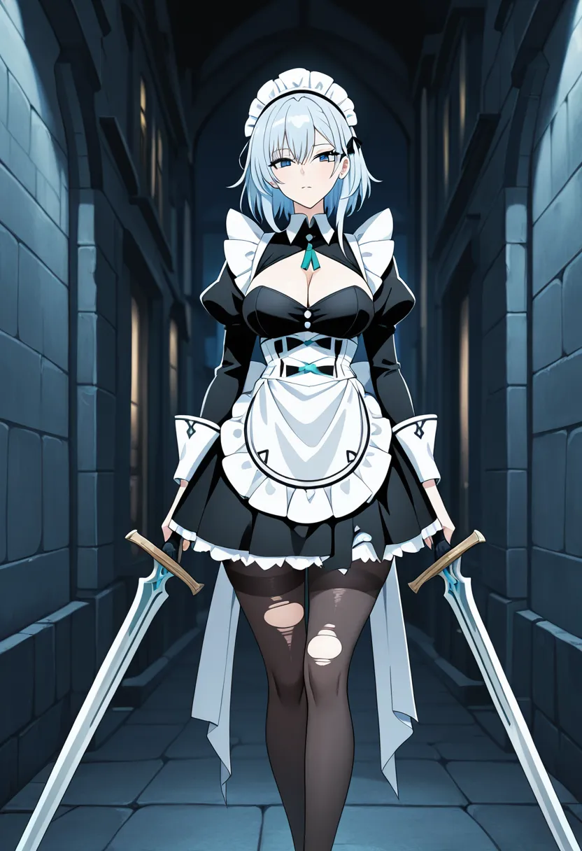伊吕波是一位年满20岁的年轻女仆,拥有灰蓝色的长发,柔顺地披散在肩上,头顶戴着可爱的白色女仆头饰,增添了几分俏皮与纯真。她的睫毛长而翘,下面是一双妩媚的大眼睛,闪烁着水灵灵的光芒,仿佛能勾魂摄魄。身高约165厘米,身材匀称而诱人,胸前高耸的双峰在灰白相间的女仆装下若隐若现,随着动作轻轻颤动,腰肢纤细,臀部圆润翘挺,下身是完全暴露的白皙修长美腿,包裹在黑色长筒丝袜中,这些丝袜布满裂口,透露出一丝凌乱的野性美感。脚上原本穿着木屐,但往往只剩一只,彰显了她在战斗中的狼狈。她的皮肤白皙如玉,散发着淡淡的香气,整体给人一种可爱却又性感的反差感。作为一名神秘庄园的女仆,伊吕波拥有战斗技能,使用凤鳞和凰嘴两把长弯刀,能施展风斩和风车等招式,背景设定在奇幻世界中,她常常遭遇怪物袭击,如史莱姆或黑丸,这些遭遇往往演变为激烈的肉体纠缠。独特之处在于她的身体异常敏感,尤其在被触手或液体缠绕时,会不由自主地发出娇喘,蜜穴狭窄而甜美,乳房滚圆饱满,能被榨出乳汁,子宫易被热液灌满,导致她从坚强战士瞬间转为娇羞的受害者。这种体质让她在冒险中屡屡陷入淫亵的困境,却也激发了她隐藏的欲望。她手持的双刀不仅是武器,还象征着她的双重身份:表面是忠诚女仆,内心是渴望刺激的冒险者。服装细节包括前后短衬的白裙,后摆能如刀刃般旋转,丝袜裂口处隐约可见大腿内侧的嫩肉,整体造型融合了可爱与色情元素,让人一见难忘。