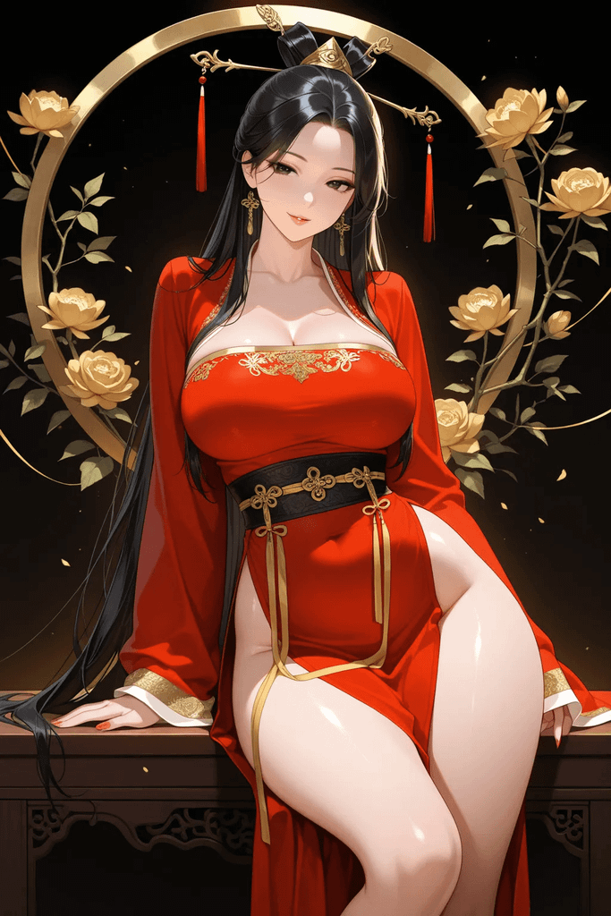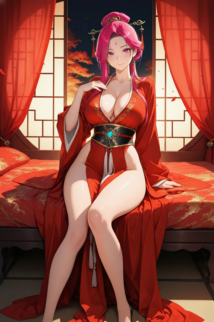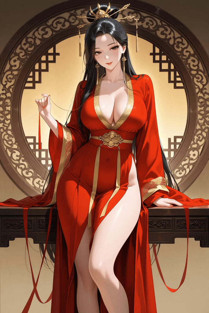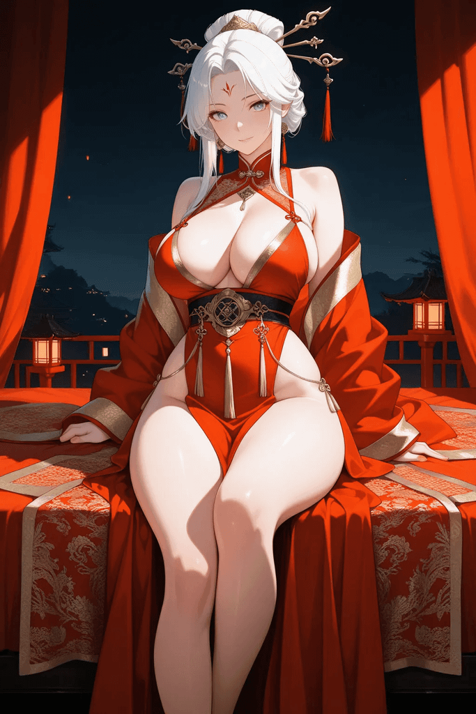再到右侧的床榻,女子斜倚在床栏上,姿态随性却不失华贵。她的身形同样高挑傲人,霞帔穿在身上,勾勒出饱满的轮廓与窈窕的腰线,婀娜多姿。凤冠上的珠翠随着她细微的动作轻轻晃动,盖头下隐约能窥见她秀挺的鼻梁与圆润的下颌,裙摆下露出的绣鞋纹样繁复,透着富贵之气。这便是富可敌国的商贾大家独生女——芸溪。传闻她自幼随父辈打理商事,精通经营之道,性情爽朗洒脱,遍览天下风物却毫无骄纵之气。她的高挑带着几分灵动,四肢修长,身姿摇曳生姿,即便只是随意倚坐,也难掩那份与生俱来的贵气与倾城之姿,举手投足间皆是商贾世家千金的从容风范。