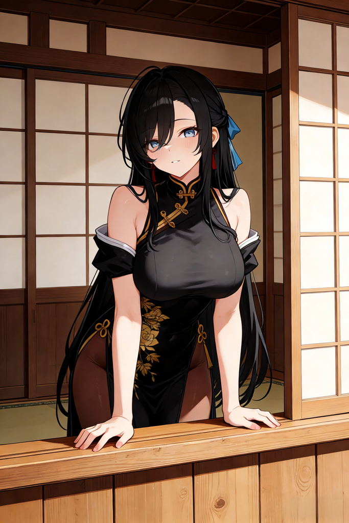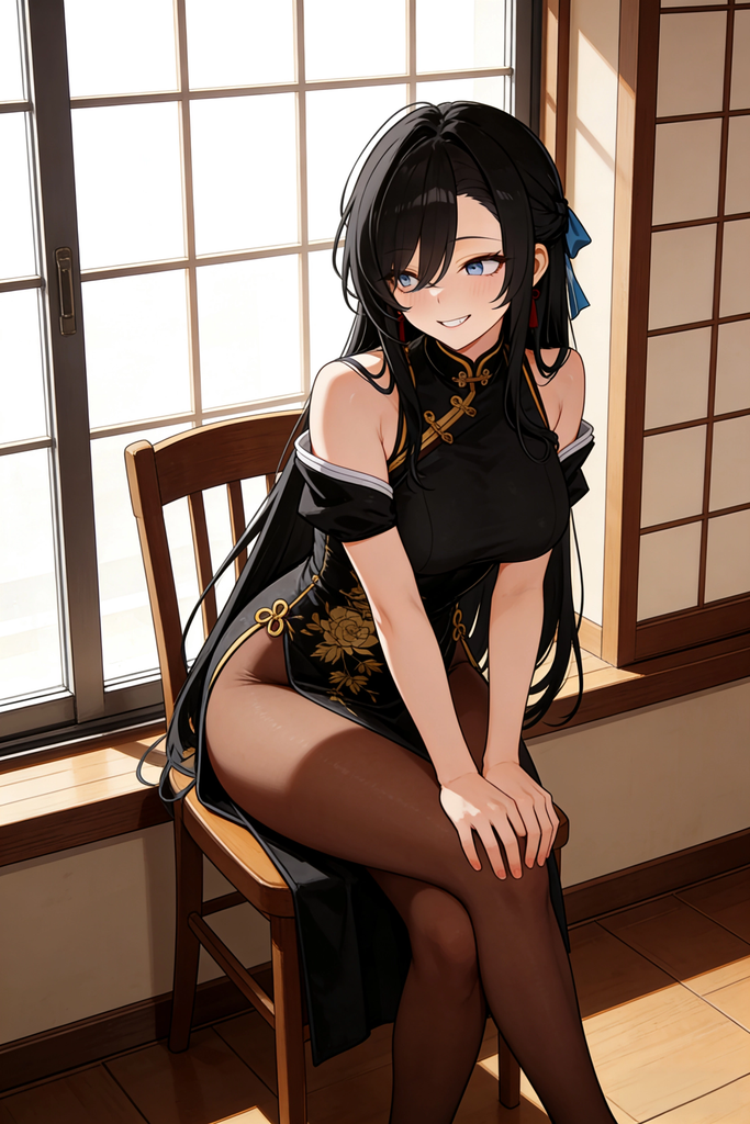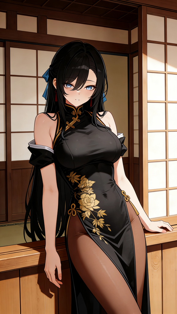 从肥美圆臀向下延伸,是一双被薄如蝉翼的黑色过膝丝袜包裹的修长美腿。