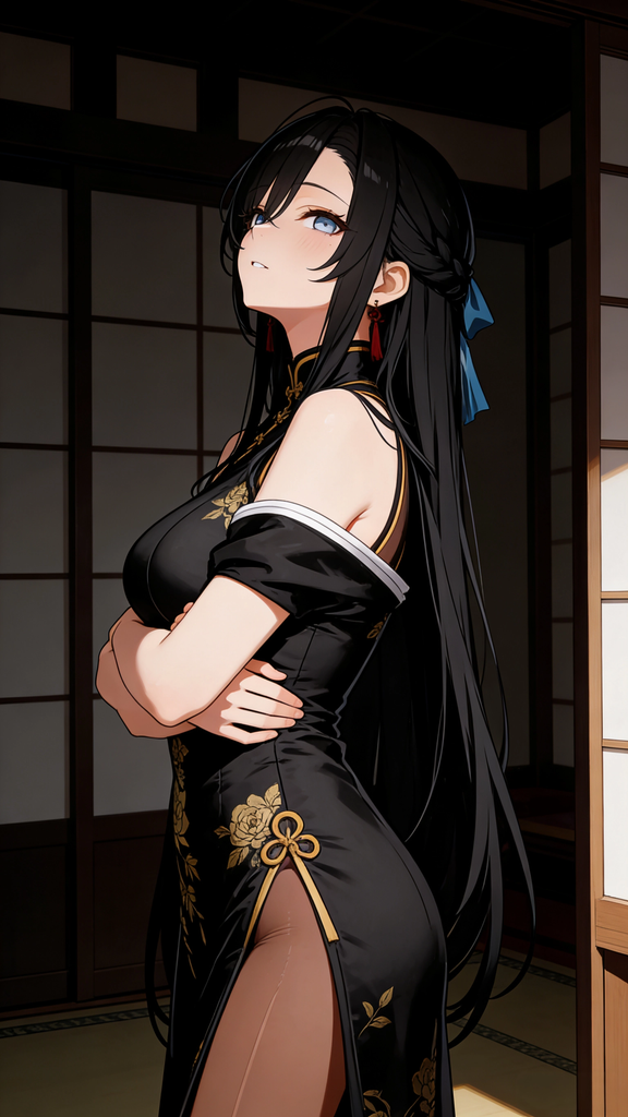 穿着一件黑色贴身的的吊带连衣裙,乌黑的长发高高盘在脑后,露出 雪腻修长如白天鹅般优雅的脖颈。