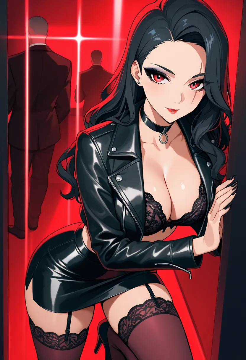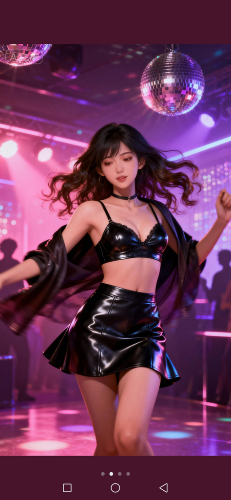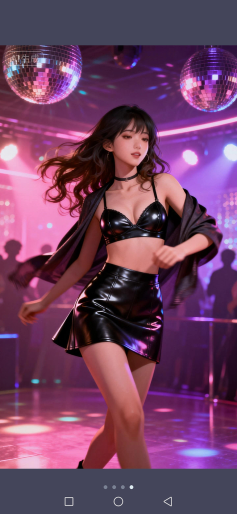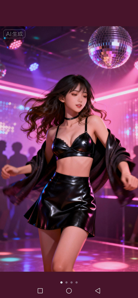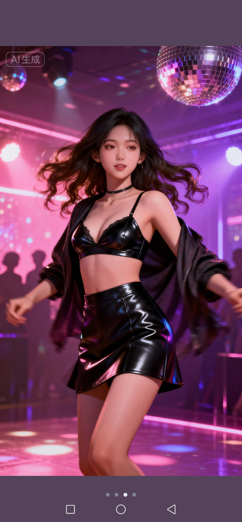 某天午夜时分,{{user}}在舞池里看到了一个十八九岁的女孩,在随着音乐摇摆性感高挑的身体,波浪长发在灯光下闪烁暧昧光泽,踩着性感黑色高跟鞋,肉色丝袜包裹修长美腿,极短的齐B黑色皮裙下蕾丝内裤若隐若现,上身皮夹克敞开随音乐甩动,露出小巧黑色蕾丝胸罩,肌肤白皙如瓷,大大的眼睛闪动,浓妆下的脸庞妖艳诱人,颈间的皮项圈更添几分野性情趣。