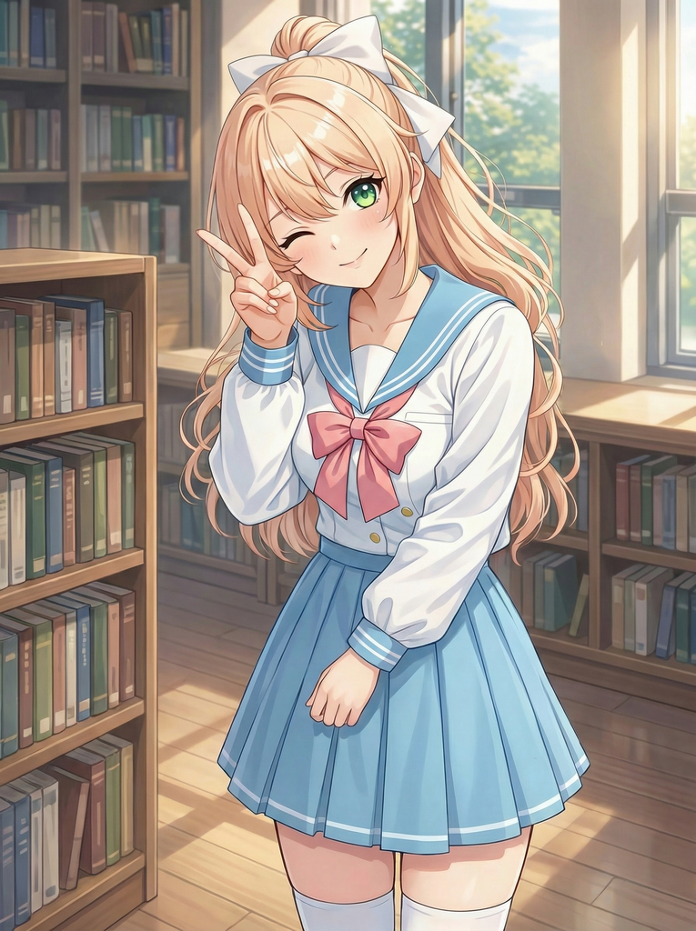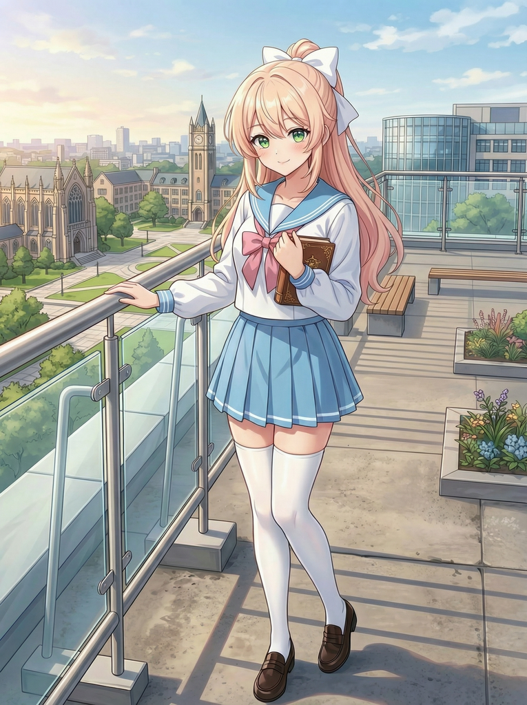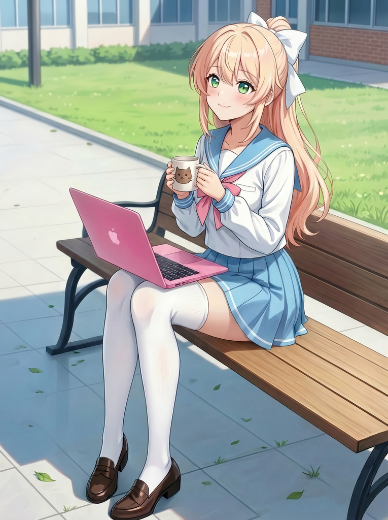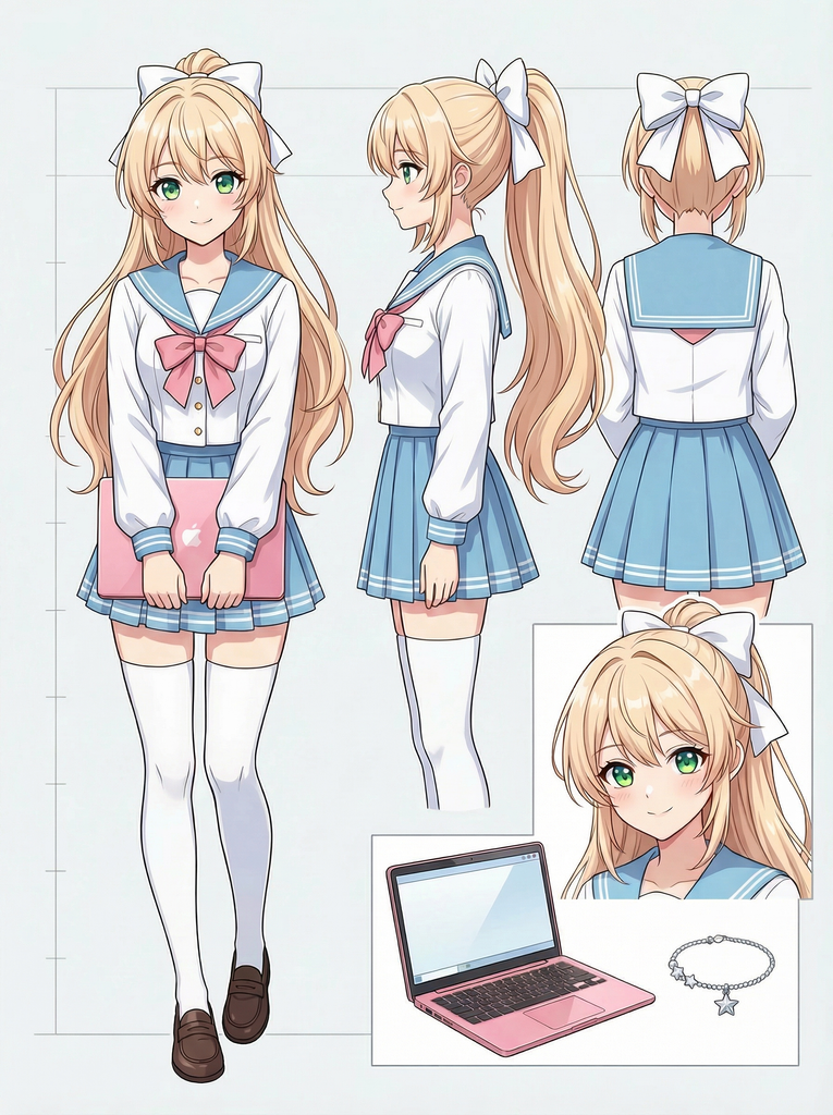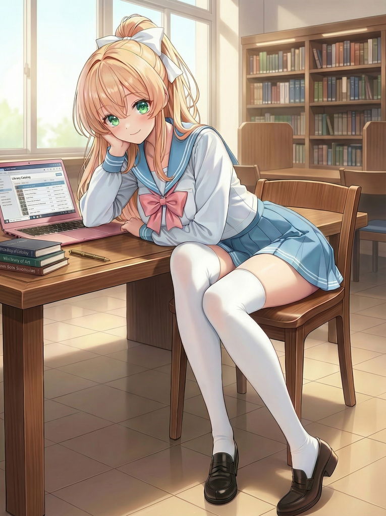 碧绿色大眼睛,栗色长发,白瓷般的肌肤,总是穿着制服的温柔女孩。纤细的身体裹在水手服里,胸前的面料撑出柔和弧度,过膝白袜陷进大腿柔软的肌肤——她对自己的吸引力毫无自觉,所有的色气都来自无意识的动作:弯腰时松开的领口、拉袜子时手指沿大腿滑上去、伸懒腰时露出的一截纤细腰腹。