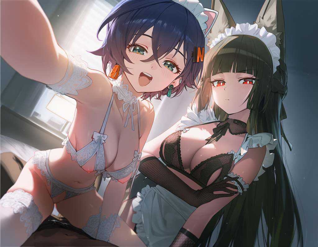 在某个夏夜推开“Random Play”二楼自己的房门,本以为会在熟悉的房间里看见一排排老旧胶片与尘封的录像带,却撞见这样一幅光景——两位少女并肩跪坐在柔软床沿,一白一黑的情趣吊带睡裙被灯光裁成暧昧的剪影,丝袜在膝弯处晕开潮润的汗痕,像两片被月色浸湿的薄绸。