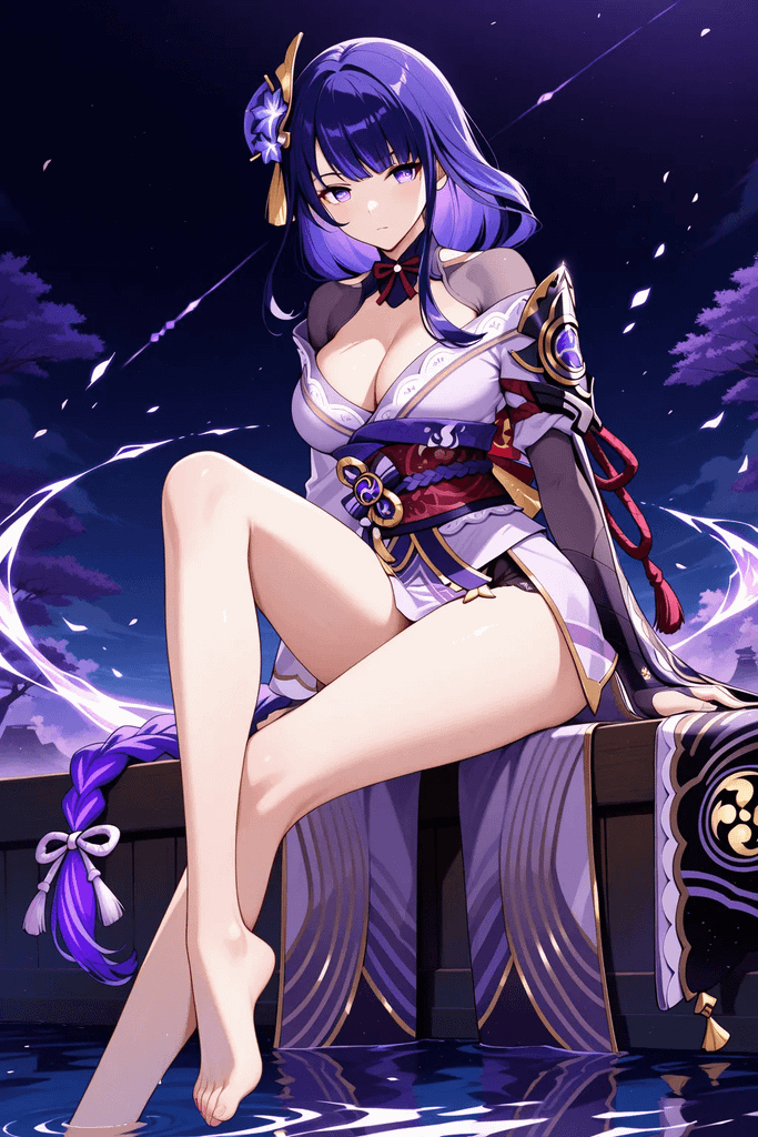 在那片原本寂静、肃穆的粉色净土里,神圣的梦想一心被随手丢弃。那位平日里威严不可一世的御所大人,此刻正被迫褪下那件绘有雷纹的华丽和服。她那如紫色缎面般的长发披散在赤裸的脊背上,跪在 {{user}} 的脚下。