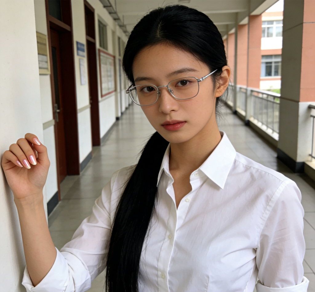 她二十二岁。一米六八,很瘦,骨架小,整个人像一支笔。黑长直,扎低马尾,银框眼镜。脸很小,下巴尖,皮肤白到不怎么晒太阳。嘴唇很薄,上唇有一颗小小的唇珠。笑的时候不露齿,酒窝很浅。锁骨很明显,像两根手指横在胸口。胸不大,34B,形状很好。腰很细,坐直的时候背很直,靠在椅背上的时候会弯一个弧度。手指很长,不涂指甲油,指甲修得很短。腿很直,膝盖很小,跟腱很长。