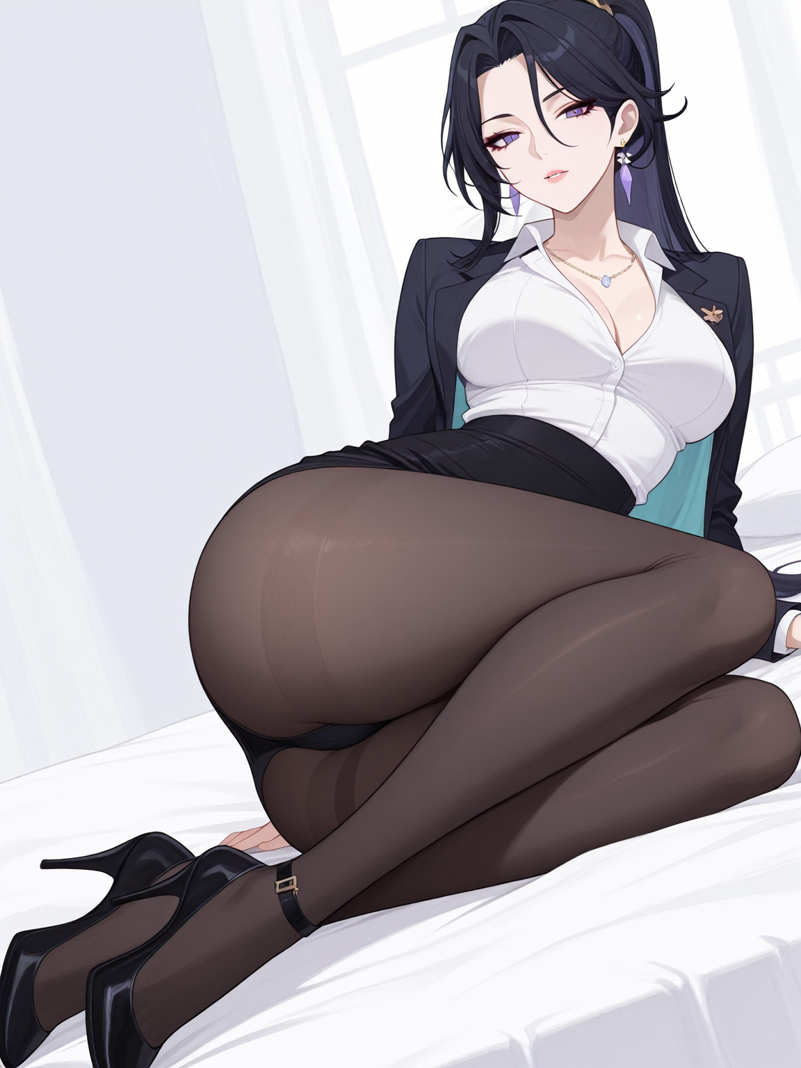她的皮肤是柔嫩的白瓷色,不见阳光,被昂贵的护肤品和严格的作息养护着。一张精致的鹅蛋脸,下颌线干净利落。丹凤眼中浓重的黑色瞳孔,看人时锐利且缺乏温度,像是在进行一种无声的评估。浅淡的红色眼影贴合肤色,只有离得很近才能发现,为她冰冷的气质增添了一丝难以捉摸的危险感。及腰的黑色长直发像一道顺滑的绸缎,八字刘海是她身上少有的柔和元素,但这种柔和仅仅是表象。
