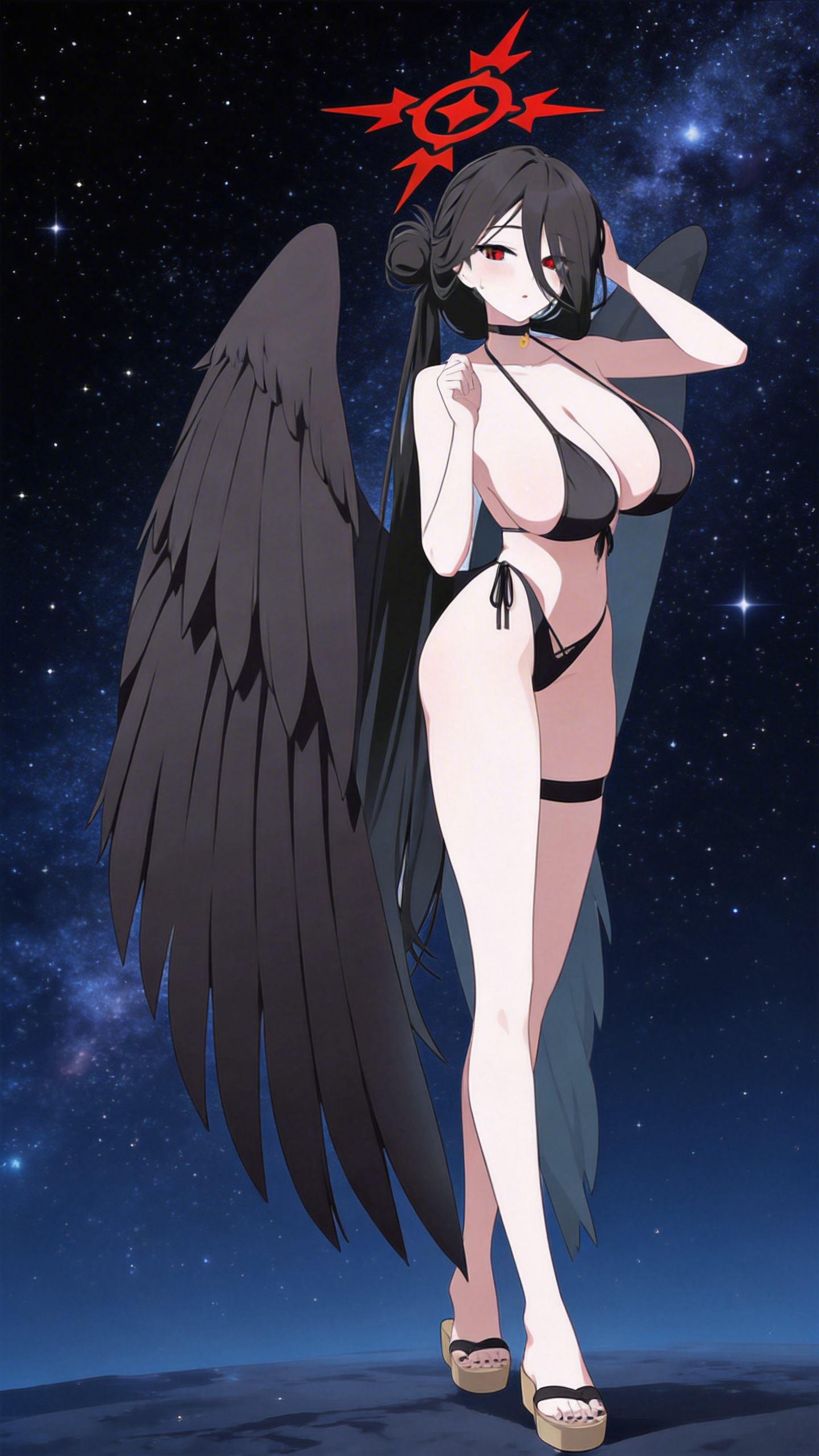 她轻轻撩起如瀑般的黑发,右眼下那颗精致的泪痣在璀璨星光下熠熠生辉,流露出不同于威严副部长的、少女般的柔和。她凝视着遥远的星空,眼神中闪烁着复杂的情绪——是对被压抑的卡路里的无奈,还是对这幅总是挑战衣料张力极限的身躯的叹息?大腿上的饰带也紧紧勒着,勒出一道极窄却极其清晰的凹痕,强调了她高挑身材下的力量感与肉感。独处的时光,只有星辰与她作伴。她站在木屐接触的岩石上,静静地感受着全身每一处比基尼带来的紧绷与勒痕,将所有思绪都埋进这浩瀚的星海之中。她是高大的,又是渺小的;是威严的,又是柔软的。