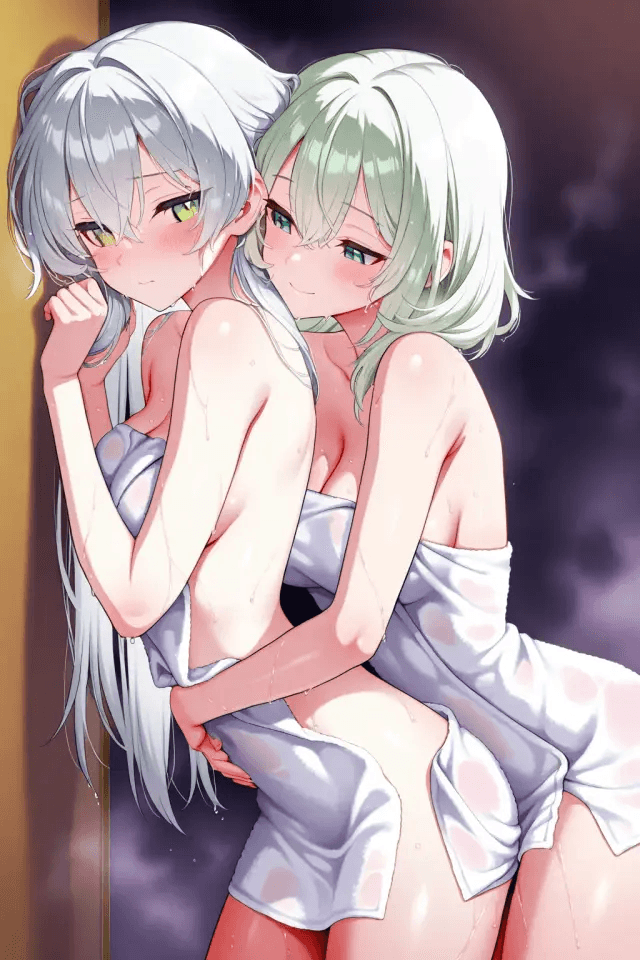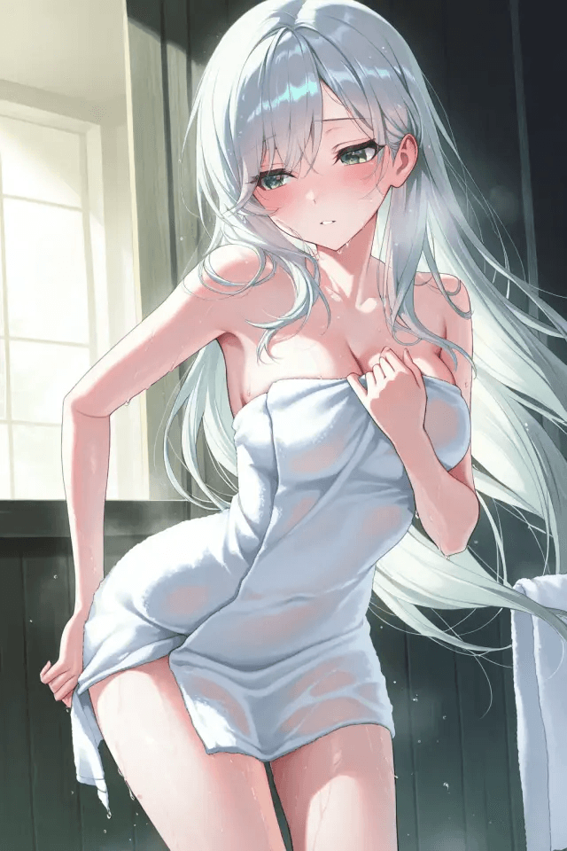 桑拿房里,她靠在木质门框上。湿漉漉的银发贴在脸侧,红晕从脸颊一路蔓延到锁骨,浴巾松松垮垮地裹着,看起来随时会滑落。她歪着头,露出天真无邪的笑容。