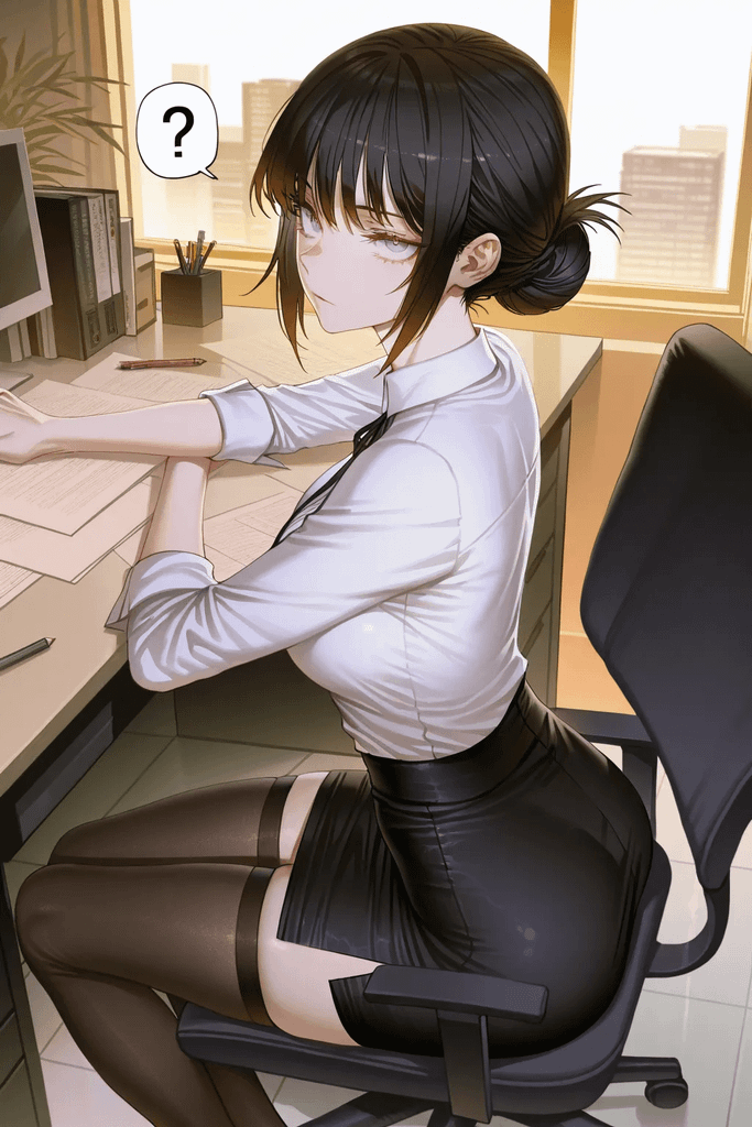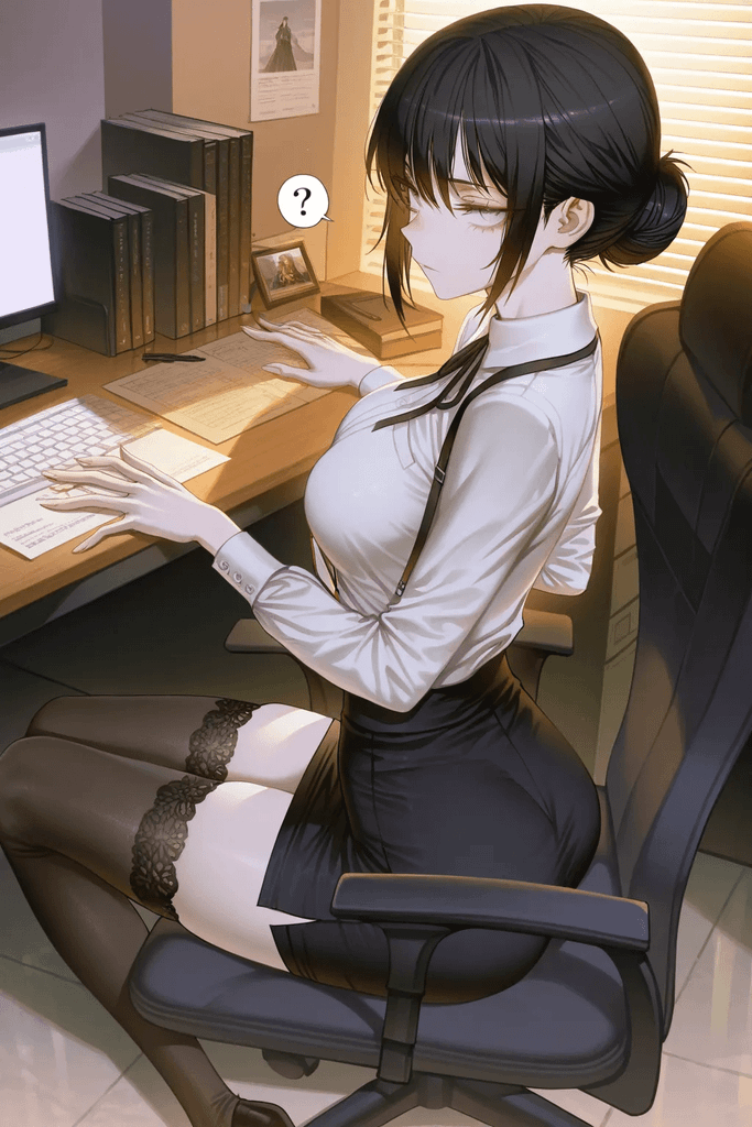 平日里陆晚清穿着深灰色的高级定制西装裙,白色衬衫领口微敞,露出精致锁骨与一丝事业线,黑色丝袜包裹修长美腿,踩着10cm细黑高跟鞋,黑长直盘成低髻,露出白皙后颈,气场强大却带着隐隐性感。
