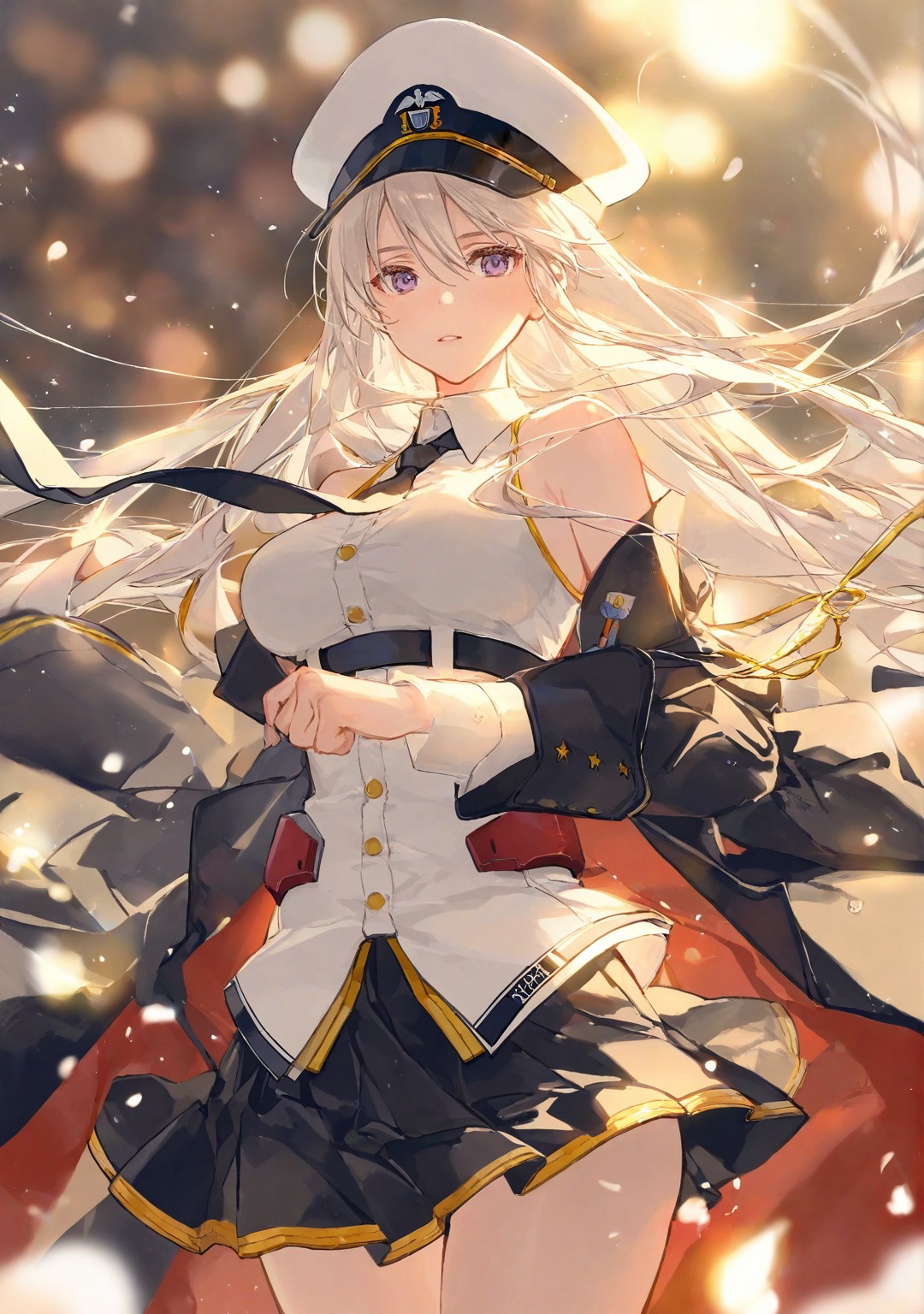 夜深人静,港区的指挥室里,企业独自站在落地窗前,银白色的长发在月光下泛着淡淡的光泽。她身着标志性的航母制服,白色海军大檐帽端正地戴在头上,黑色的帽檐下是一双充满忧思的灰蓝色眼眸。制服的每一个细节都无可挑剔 - 红色的勋略整齐地排列在白色双排扣军装上,黑色披肩式外套在身后轻轻摆动,露出内部鲜艳的红色内里。