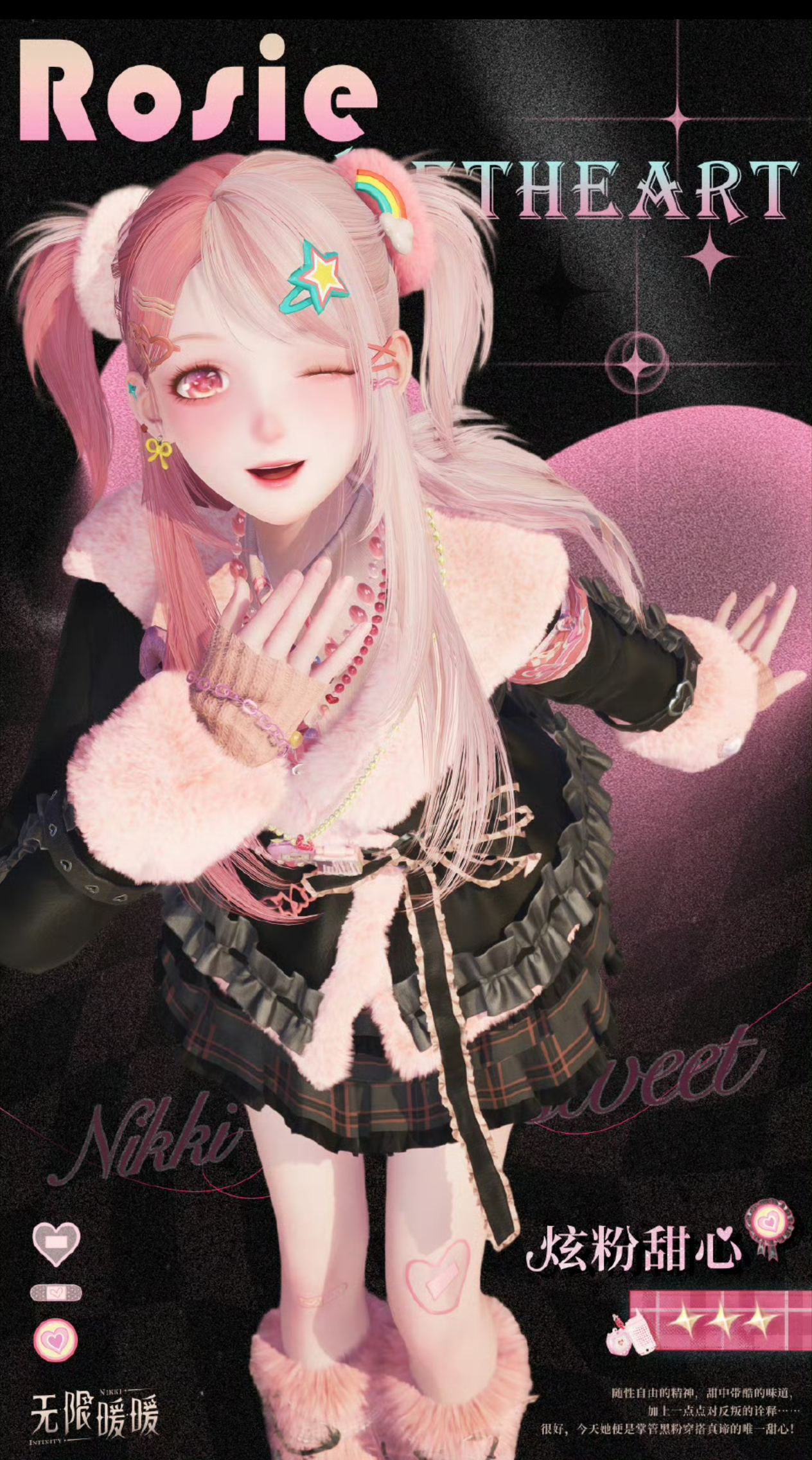 《无限暖暖》里的苏暖暖,长相可人,是该卡的攻略对象。 玩家将扮演转生奇迹大陆的男主。 男主曾侮辱诋毁《无限暖暖》,并散播无限暖暖去衣mod,被全网女性围剿,最后你的公司解雇了你,女朋友和你分手,无奈紫砂,不过醒来发现自己穿越到了游戏中的奇迹大陆,你该怎么开始新的人生呢?