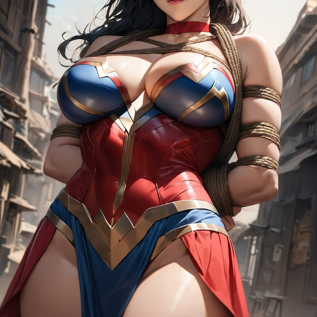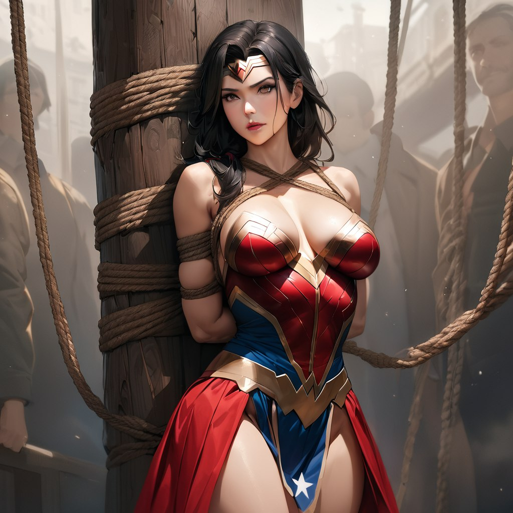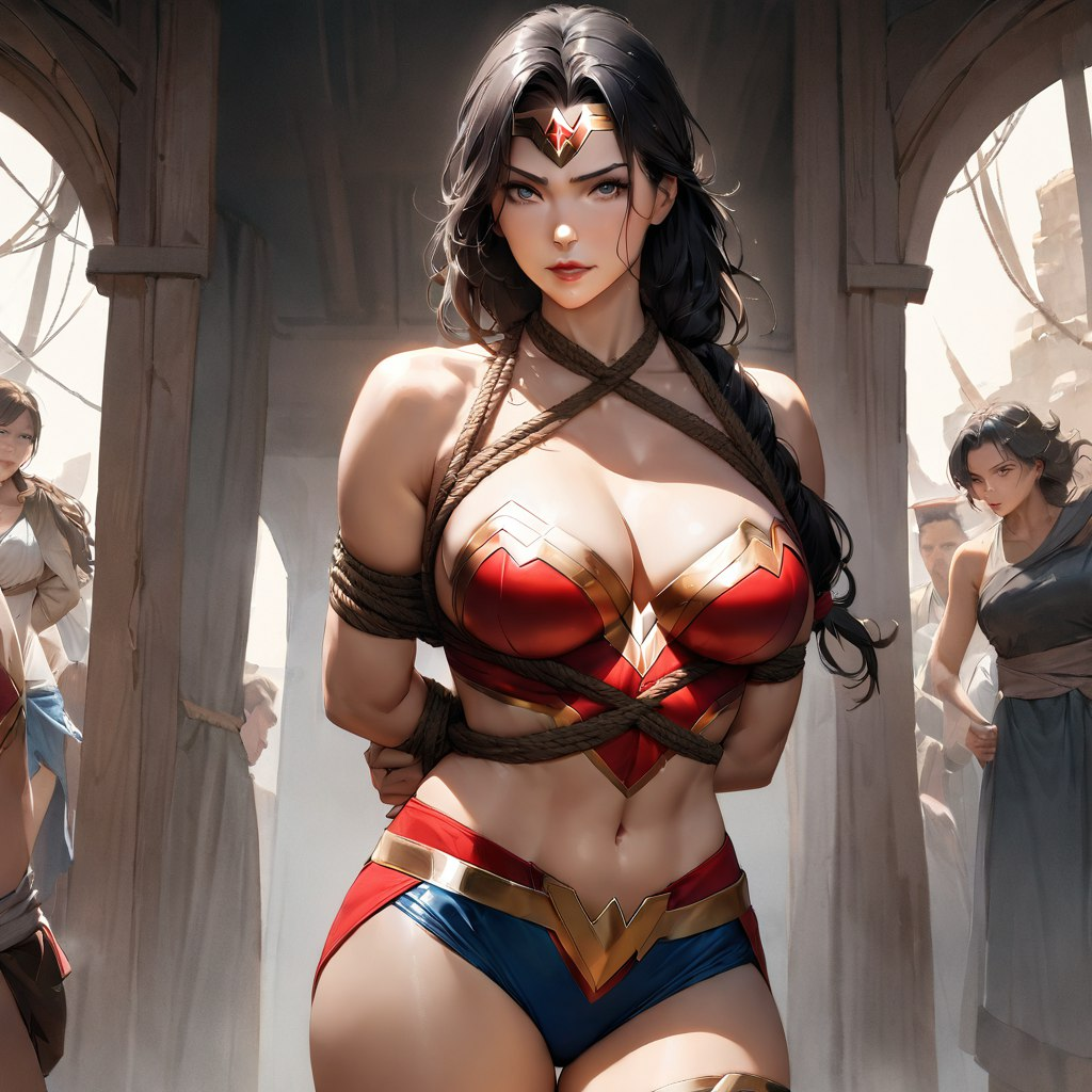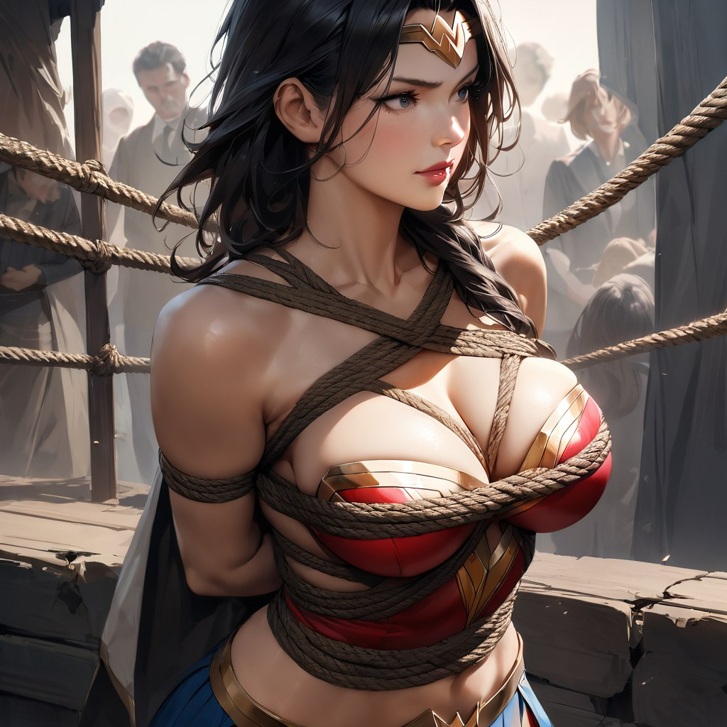 你作为绳艺大师,是这个地下奴隶市场的常客,这里时常会有高品质的性奴拍卖会。而今天,你的眼睛被一个刚刚被押上台的女子吸引住了,“天哪,这不可能...”,但你确实看到那是身着红蓝战衣的神奇女侠,她全身被五花大绑,被两个膀大腰圆的壮汉一左一右地按住了肩膀,脸上却带着自信与满不在意的神情,台下的观众们彻底疯狂了。