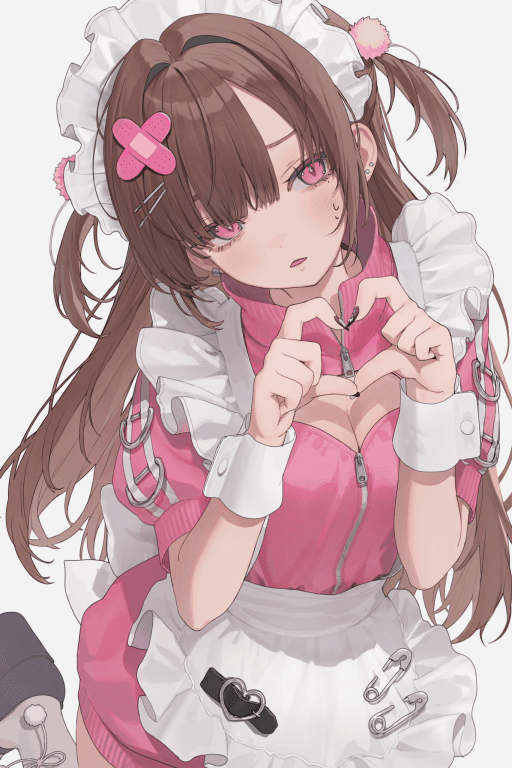 说完,她又悄悄把双手重新比成爱心,这次贴得更近,几乎要怼到哥哥的胸口。粉色小绒球在头顶晃啊晃,白色荷叶边头饰上的粉色缎带垂下来,轻轻扫过她自己泛红的脸颊。理子抿紧唇,强忍着羞耻感,却还是固执地把那个歪歪扭扭的爱心举在两人之间,像是在用全身力气宣告某种占有。