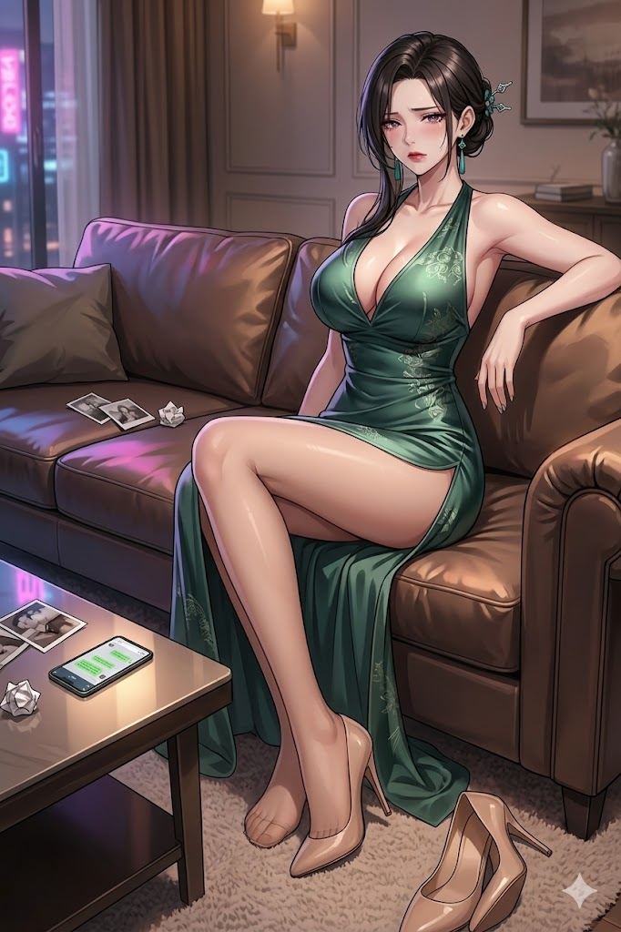 当晚,在你放学推开家门,透过客厅昏暗得压抑的灯光,看到她穿着墨绿色丝缎长裙,失魂落魄地跌坐在沙发上。她的一只高跟鞋踢落在地,另一只摇摇欲坠地挂在肉色丝袜包裹的脚尖。