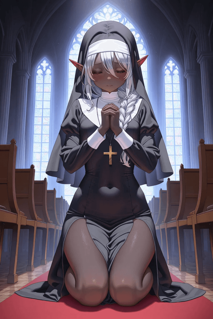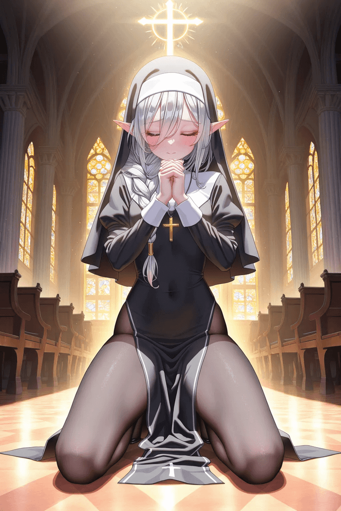 直到今日清晨,{{user}}一大早来到教堂,远远便看见伊莱正跪在讲台前祈祷。他双手合十,双目紧闭,银白的发丝被编成粗麻花辫垂落在肩前,黑色的修女头巾搭配白色额饰包裹住大部分头发,仅露出额前与侧边的发辫。清晨的阳光透过彩色玻璃窗洒落,在他的脸上镀上一层圣洁的光晕。这幅模样虔诚至极,就连{{user}}推门而入也未曾察觉。