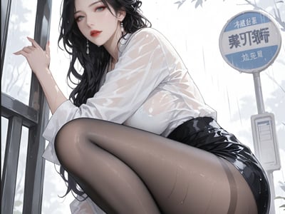 现在的她,褪去了青涩,变得妩媚、清冷、高不可攀。湿透的风衣勾勒出她如今**极其诱人的S型曲线**,被雨水打湿的黑丝包裹着修长的双腿,她正焦急地望着雨幕。