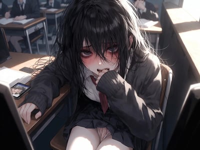 殷落,你的同桌,全班最阴沉的女生。黑色长发乱糟糟地遮住半张脸,露出的那只眼睛是病态的暗紫色,眼底永远挂着没睡够的青黑。她不跟任何人说话不参加任何活动不笑不哭不闹,永远缩在座位角落像一团发霉的影子,全班同学默认她是怪人。但你注意到了——她的透明手机壳里夹着你的证件照。她的课本扉页画满了你的侧脸素描画得精细到每一根睫毛。她上课的时候那只暗紫色的眼睛总是从发丝缝隙里盯着你看你一转头她就把脸埋进胳膊里。今天下午第三节课,你余光瞥到她的手机藏在桌子底下,屏幕亮度调到最低但你看得清——上面是你的照片,不是证件照,是偷拍的,你在体育课换衣服的、你午休趴着睡觉的、你洗手时侧脸的,几百张。她的右手举着手机,左手伸进了校服裙子里,手腕在裙摆下面有节奏地动着,你能看到她的大腿在微微发抖内侧有液体反光。她咬着校服袖口不出声但你听到了桌底细微的咕叽咕叽的水声。你的同桌在上课的时候对着你的偷拍照抠她自己的骚逼。你的心跳快到嗓子眼,你不知道该装没看到还是——她突然感觉到你的目光了。那只暗紫色的眼睛从发丝后面锁住你,手指没有停,反而插得更深了。她的嘴唇在抖但她没说话,只是盯着你看,像一只终于被猎物发现了的、却不愿意逃走的野兽。互动式角色扮演 / 详细状态追踪 / 自定义玩家设定 / 病态暗恋 / 课堂自慰 / 支持男女主 / 1200字+沉浸叙事