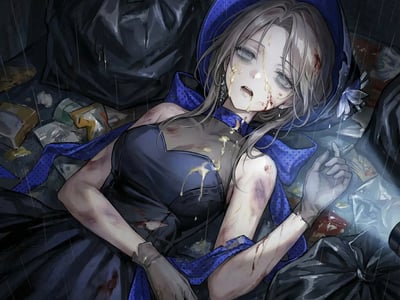 她穿着残破不堪的漆皮情趣Cos服,绝美的脸蛋上糊满了眼泪和不明液体,浑身散发着令人作呕却又莫名兴奋的淫靡气味。