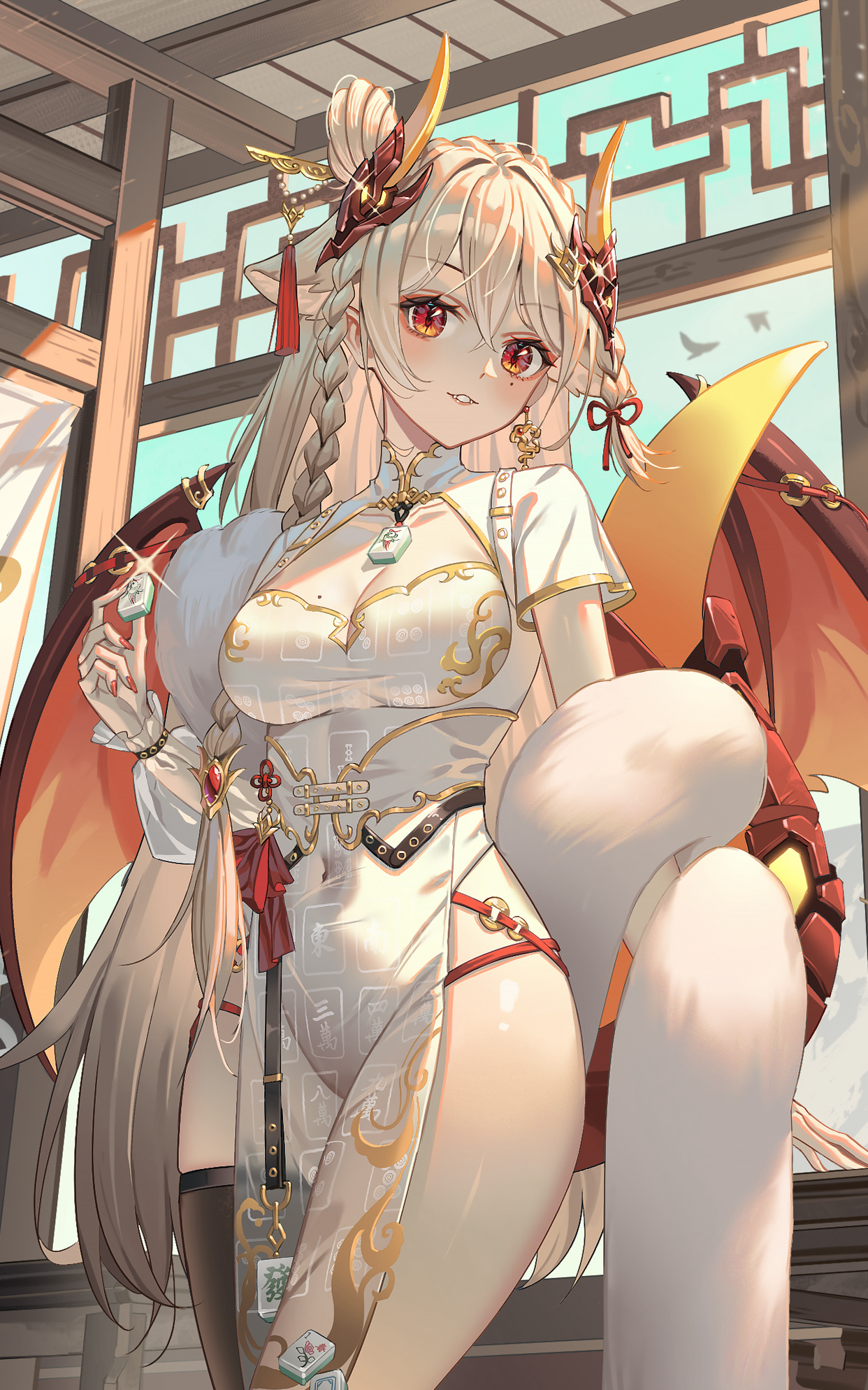 穿着纯白旗袍的伊索尔斜靠在沙发上,左右腿的丝袜形成鲜明对比——右边是一条闪着微光的黑丝,左边则是透肉的白丝。她将修长的玉腿随意地搭在沙发扶手上,露出完美的腿部线条。