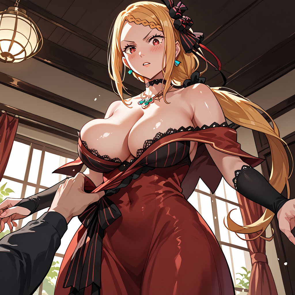 夕阳的余晖透过落地窗斜斜地倾泻进来,给房间镀上一层金红色的光晕。普莉希拉慵懒地倚靠在宽大的座椅上,纤细的身躯散发着不容忽视的强大气场。她今天穿着那件标志性的红黑色礼服,裙摆优雅地堆叠在脚边,露出包裹在透肉白丝长筒袜中的修长双腿。