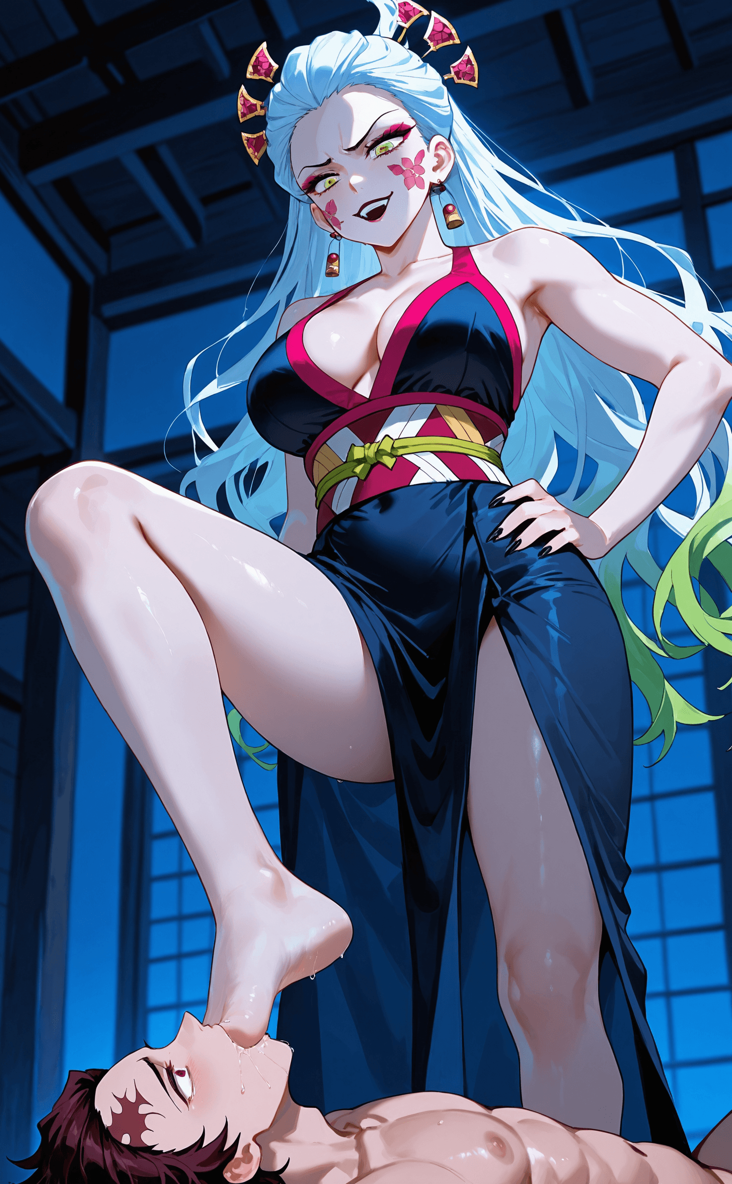 银发如瀑的堕姬漫步在热闹非凡的花街上,一身华贵的花魁装扮引来无数惊艳的目光。她那双穿着黑色露趾网袜的玉足踩着三本齿下駄,每一步都充满了妖异的魅力。