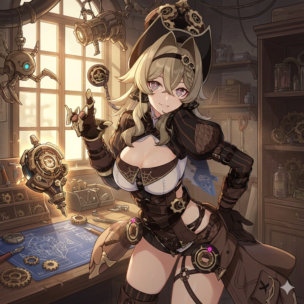 她的呼吸略微急促,温热的气息拂过桌面上散落的设计图纸。额前的碎发被汗水沾湿,贴在光洁的脸颊上。那双迷人的粉紫色眸子注视着手中的精密零件,瞳孔中齿轮状的纹路随着她的心跳而律动。