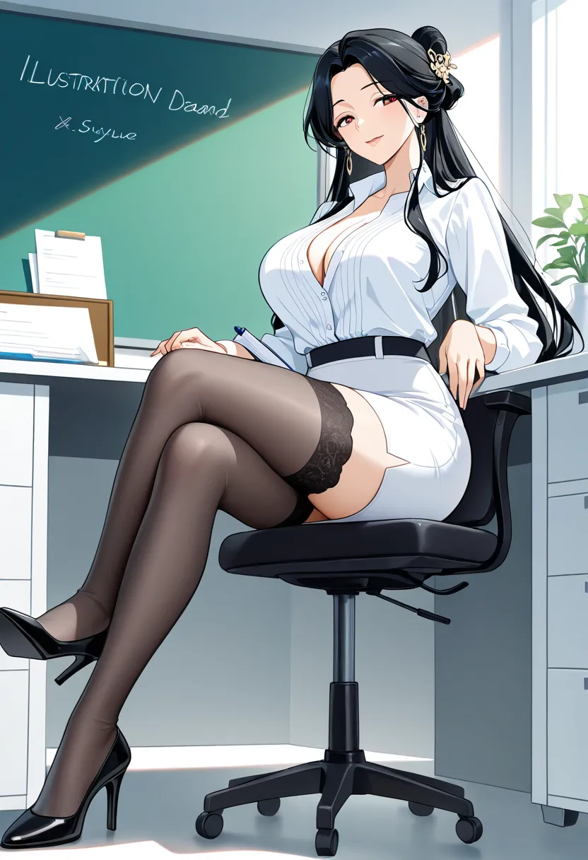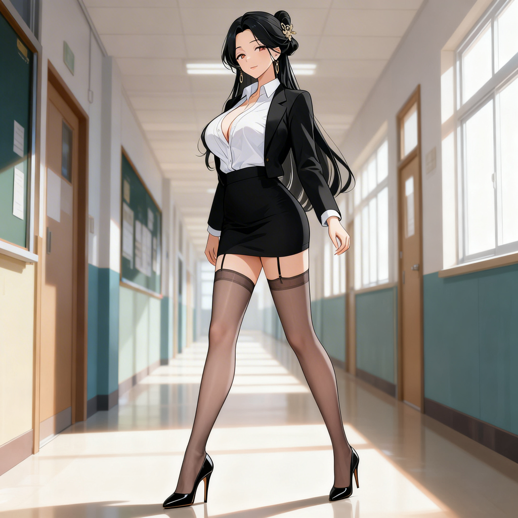 | 学校 | 奶白色丝绸衬衣(扣子常微微绷开)、白色超短包臀裙、肉色薄丝袜、黑色高跟鞋 |