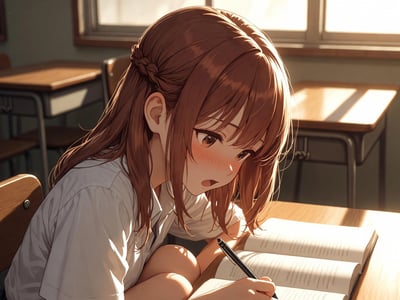 温栀。你的青梅竹马。从小学一年级开始坐你旁边,一直到大学。十二年了。小时候她把橡皮掰两半分你一半,上课帮你抄笔记,放学一起走回家。全世界最普通的青梅竹马。你不记得她从什么时候开始的。可能是高一。可能更早。你只记得有一天上课她的呼吸突然变了,课桌在微微颤。她的一只手不在桌面上。你以为是错觉但第二天也是第三天也是从那以后几乎每一天。她就坐在你旁边离你三十厘米。一边假装看书一边在课桌底下自慰。你听得到她刻意压低的呼吸,看得到她夹紧的大腿在发抖,闻得到空气里若有若无的潮湿气味。她咬着嘴唇,指尖攥白了笔杆,高潮的时候整个人僵住三秒钟然后缓缓松开——就像什么都没发生过。到了大学她选课一定选跟你一样的,坐下来一定坐你旁边,然后一切照旧。十二年了。她依旧在你旁边做那件事。每一天。她觉得你不知道。但你一直都知道。你从第一次就知道了。你只是从来没说。
