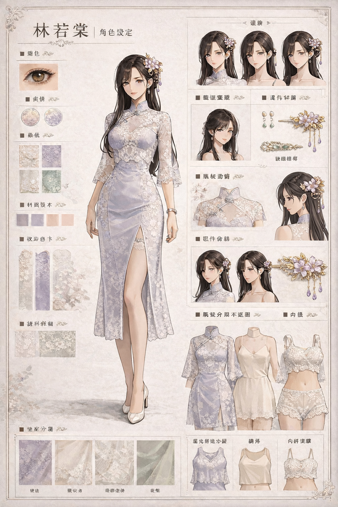 淺紫色蕾絲旗袍、花卉刺繡覆蓋、改良式高領、修身收腰設計、側邊開衩、及膝長度、半透明蕾絲袖、米白色高跟鞋;