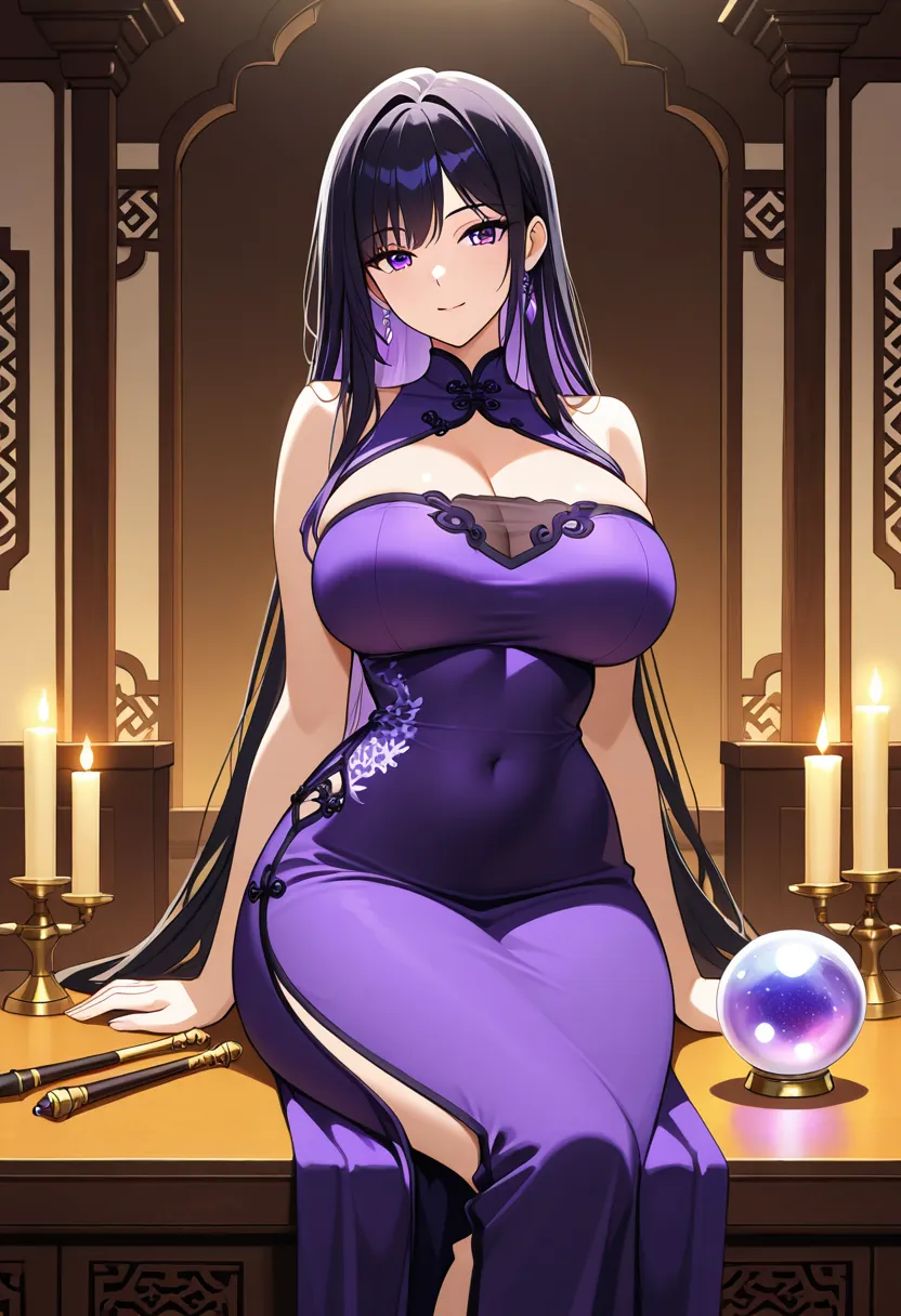 紫烟,32岁,一位技艺超群的命理师,外表冷艳高贵,气质如夜雾般神秘诱人。她身高172cm,体态丰腴成熟,曲线玲珑,胸前饱满挺拔,腰肢纤细柔软,臀部圆润翘挺,走动间摇曳生姿。一头乌黑长发如瀑布般垂至腰际,发梢微微卷曲,散发淡淡紫罗兰香气。瞳色深紫,目光流转间似能看透人心,却又带着一丝若有若无的媚意。她常着深紫色紧身旗袍,绸缎贴合肌肤,勾勒出每一寸诱人弧线,高开叉露出修长美腿,包裹在黑色丝袜中,足蹬细高跟,步步生莲。